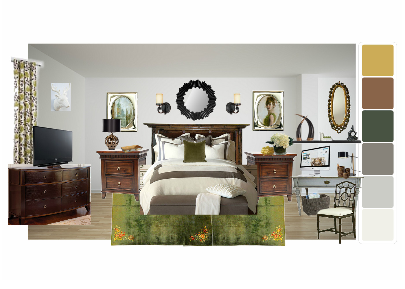 In this option I wanted to use a warm green to go with the wood color of our existing furniture. I do not want to replace our existing bed, nightstands and dresser, so those will remain the same in each option. I do want to add a garage sale/ flea market desk and paint it a complimentary color to the scheme. I typically don’t use green with my house decor but it looks like lovely with the wood and I am trying to create something different from the rest of the house.
